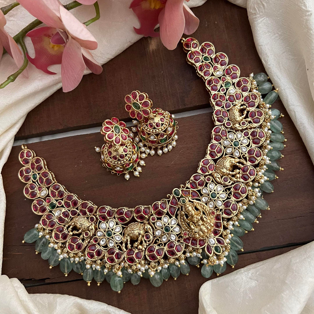 Bring prosperity and elegance to any outfit with our Precious Red Stone Lakshmi Elephant Neckpiece. Adorned with pastel green beads and pearls, this luxurious piece features a stunning red stone Lakshmi elephant design that embodies beauty and good fortune. Perfect for any occasion, this neckpiece will make you feel like a true queen. Comes with matching earrings.