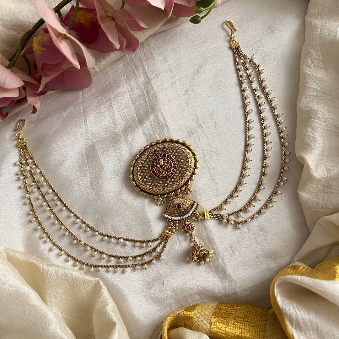 Elevate your look with our Unique Jada Billai featuring a delicate Pearl Maatil-Bun Billai. Handcrafted with precision and adorned with a lustrous pearl, this piece is a stunning addition to any ensemble. Add a touch of elegance and sophistication to your style with this one-of-a-kind accessory.