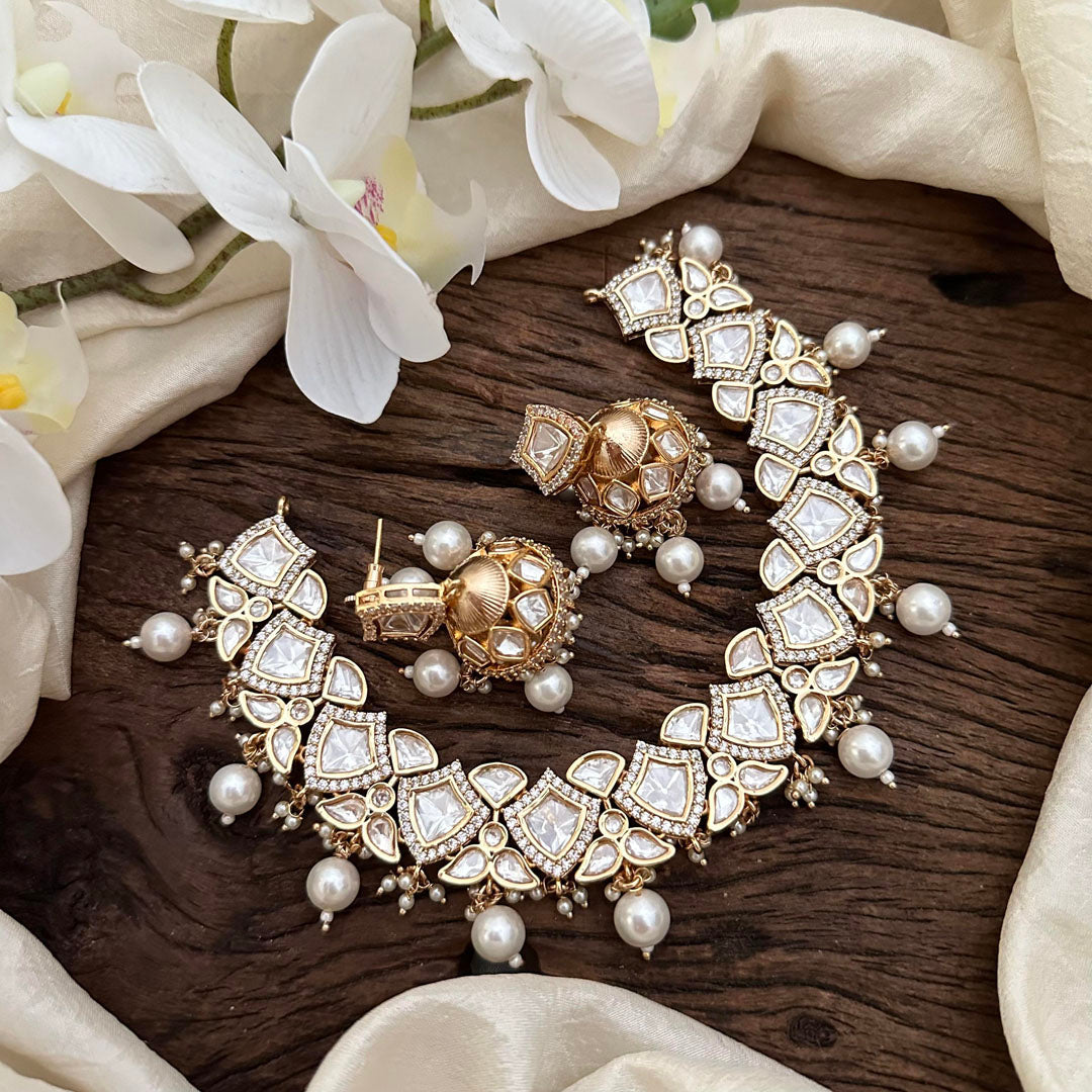 Indulge in luxury with our Precious Rose Gold Moissanite Kundan Neckpiece. Its glistening white Moissanite stones and elegant Kundan detailing elevate any outfit. Complete the look with the matching earrings. A timeless addition to your jewelry collection.