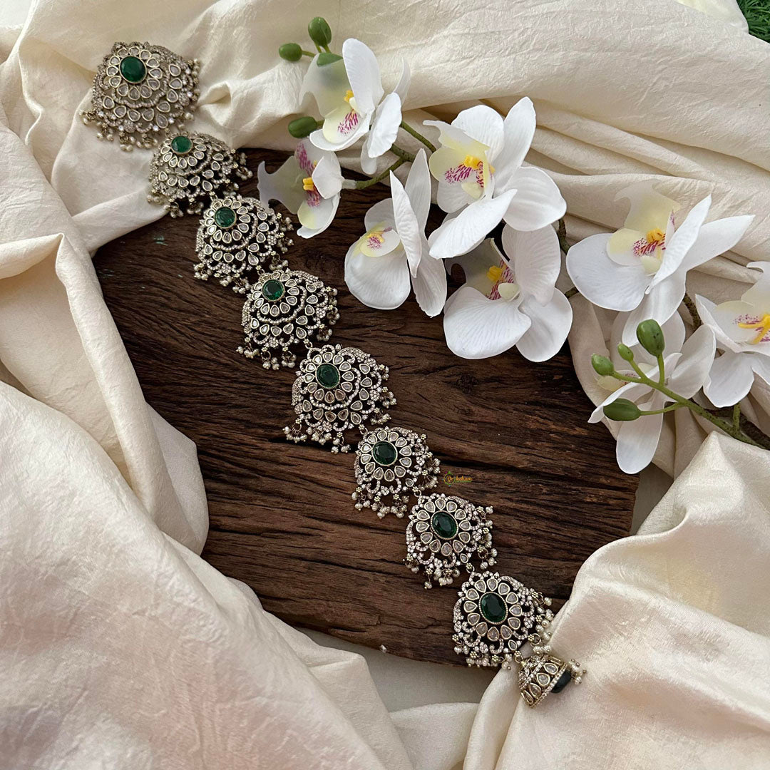 This exquisite Precious Victorian Diamond Bridal Jada Billai-Hair Accessory is the epitome of elegance and luxury. Featuring an 8 pendant design with a stunning green center stone surrounded by shimmering white stones, it adds a touch of sophistication to any bridal look. The pearl accents only add to its charm and make it a truly precious piece. Elevate your style with this exclusive accessory.