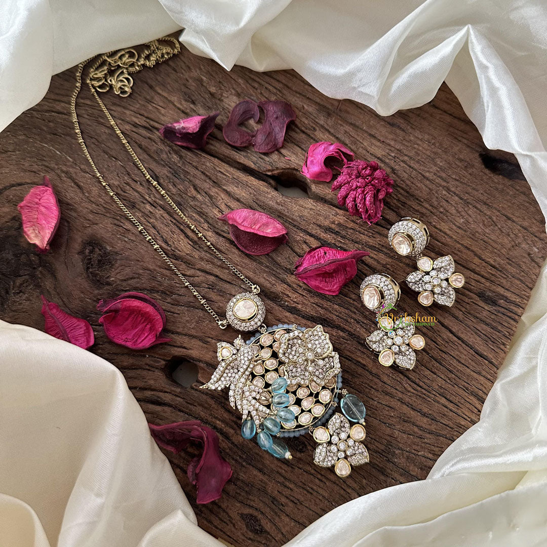 Precious Victorian Diamond Peacock Pendant Chain-Sky Blue Bead-VV1835