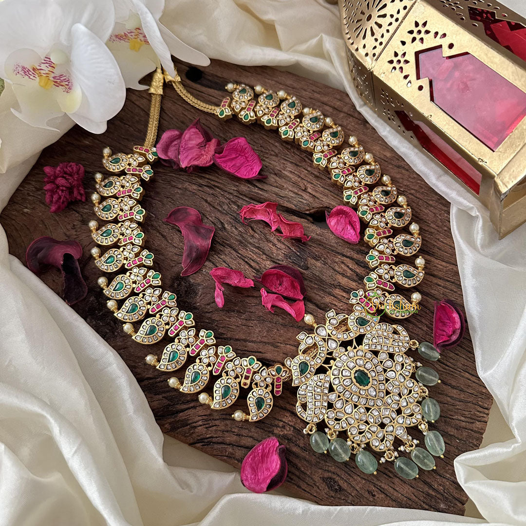 This exquisite Precious White Green Kundan Jadau Manga Haram adds a touch of luxury to any outfit. Featuring beautifully crafted green Kundan stones and delicate aqua green beads, this necklace is a true work of art. Elevate your style and make a statement with this one-of-a-kind piece.