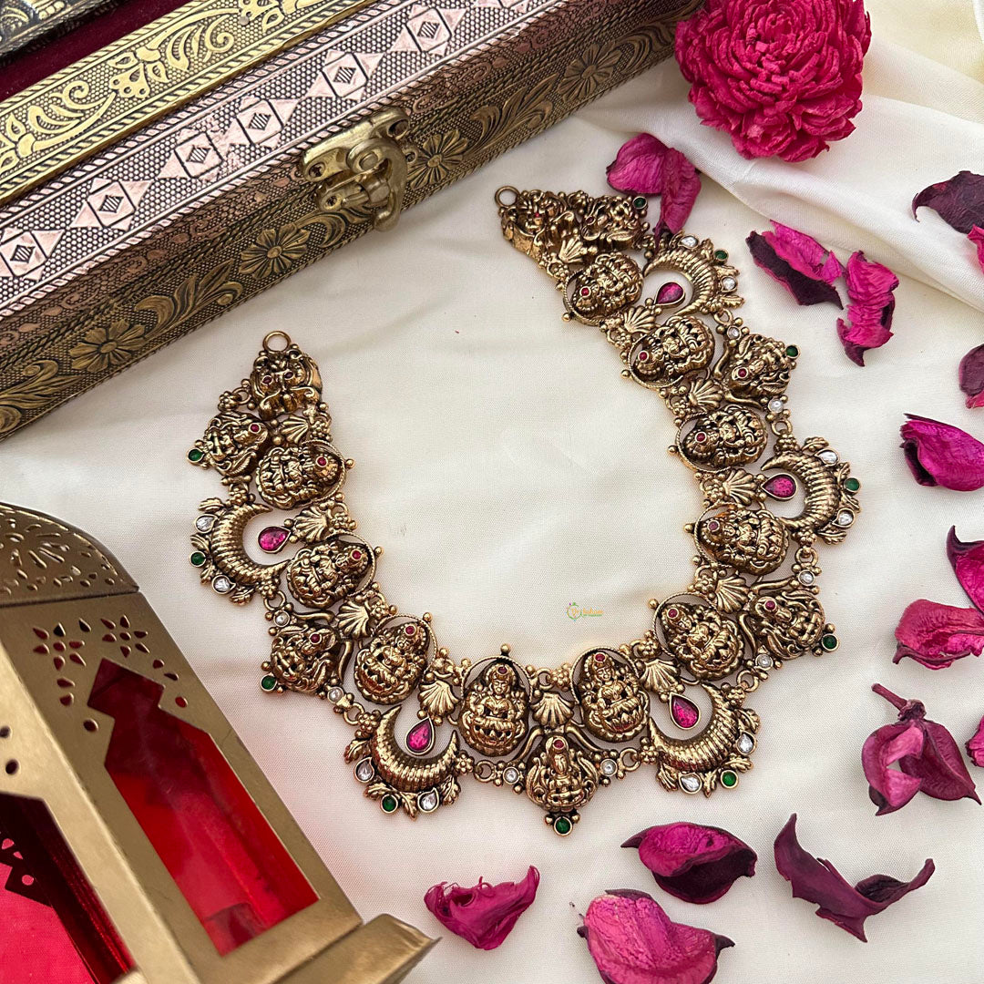 Indulge in luxury with our exquisite Premium 1 gm Gold Lakshmi Neckpiece. The intricate design features a touch of red, white, and green ad stones, adding a touch of opulence to your ensemble. Feel exclusive and elegant with this one-of-a-kind piece, expertly crafted to perfection.