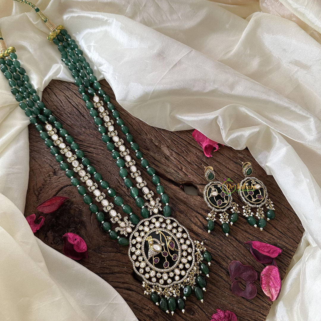 Elevate your look with our Premium 3 Layer Victorian Diamond Peacock Pendant Haram. Adorned with green beads, this pendant exudes luxury and grace. Embrace the elegance and sophistication of this exquisite piece, featuring a stunning diamond peacock design. Enhance your ensemble with this exclusive and timeless addition to your jewelry collection.