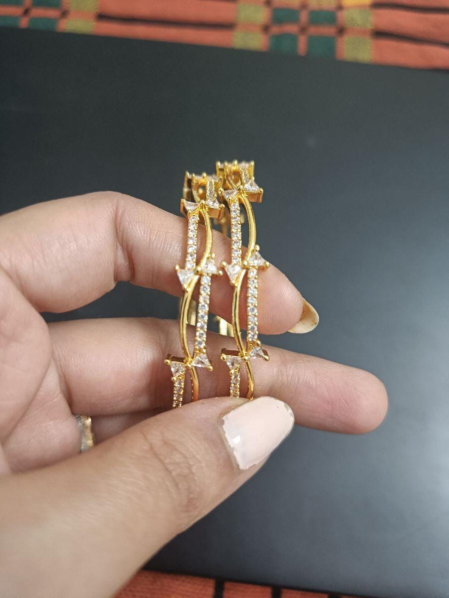 Premium AD Stone Bangles -White – Gold look alike polish; AD stone studded festive wear bangles; Doesn’t come as individual pieces.