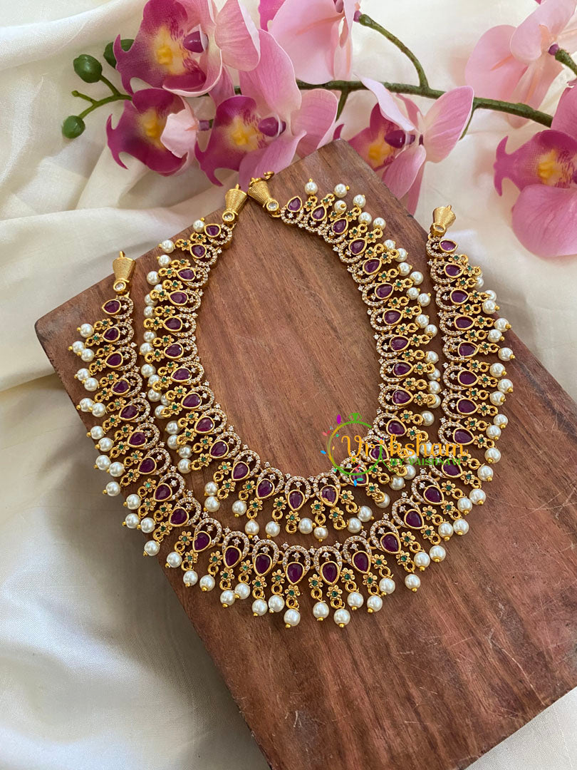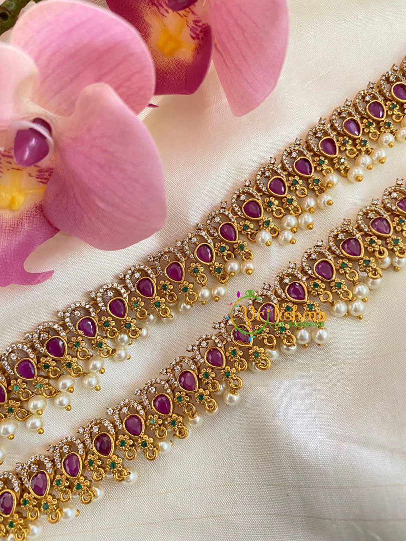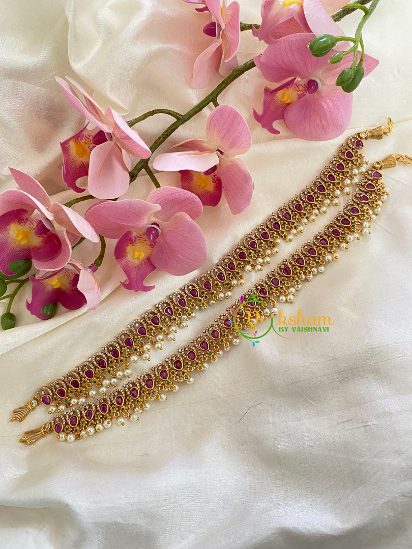 Premium AD Stone Bridal Anklets – American Diamond petal shaped pattern Anklets is an Elegant and Premium Quality gold look alike anklets. This is an elegant american diamond style jewellery which has red and green stones.