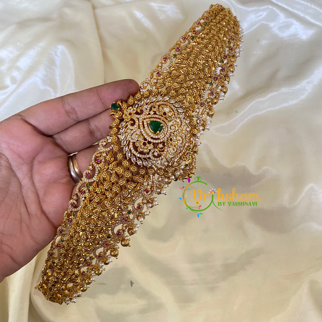 Premium AD Stone Bridal Hipbelt with green and red imitation stone and floral pattern. Pearl finish pattern.