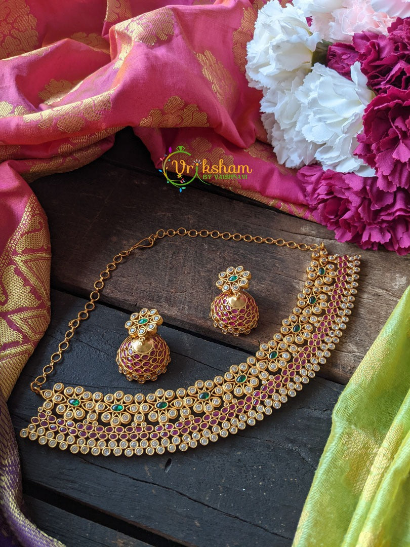 Premium AD Stone Choker -Floral Pattern - red and green imitation stones and white ad stone arranged choker, comes with matching jhumkas.