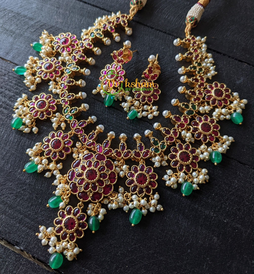 Premium AD Stone Choker -Red -predominantly red and white stone and green stone studded with pearls and green bead finish, comes with matching earrings.