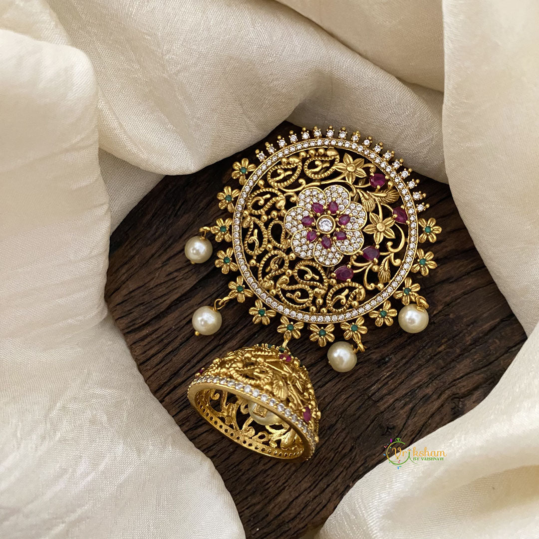 Premium AD Stone Floral Bun Billai-Jhumka - hair accessory for festive braids hairstyling. Finishing done by white pearls and with touch of red, green and white stones.