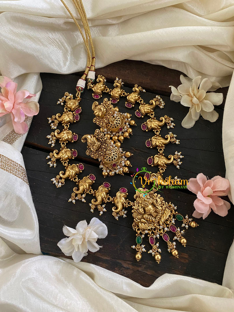 Premium AD Stone Ganesh Neckpiece- Ganesh pendant and elephant pattern–green,red imitation stones and white ad stone arranged choker, comes with matching jhumkas.