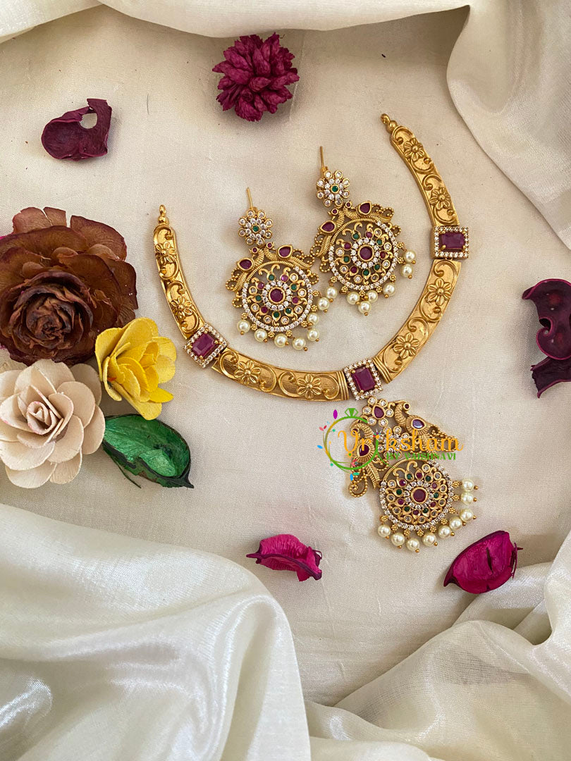 Premium Temple Hasli Choker - premium quality AD Stone studded pendant hasli short neckpiece, comes with matching earrings.