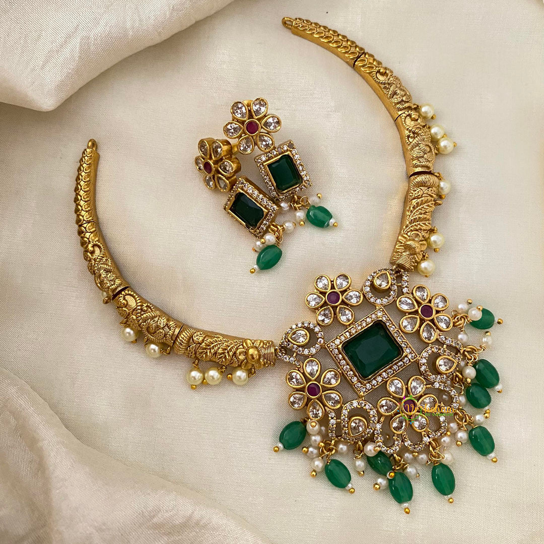 Premium AD Stone Hasli Choker-Purple Beads- Premium AD Stone Hasli Choker with the pattern of one big green square surrounded by white AD Stone flower with touch of red stone. For finishing green beads and pearls are used to make it more attractive. Hasli short neckpiece, comes with matching earrings.