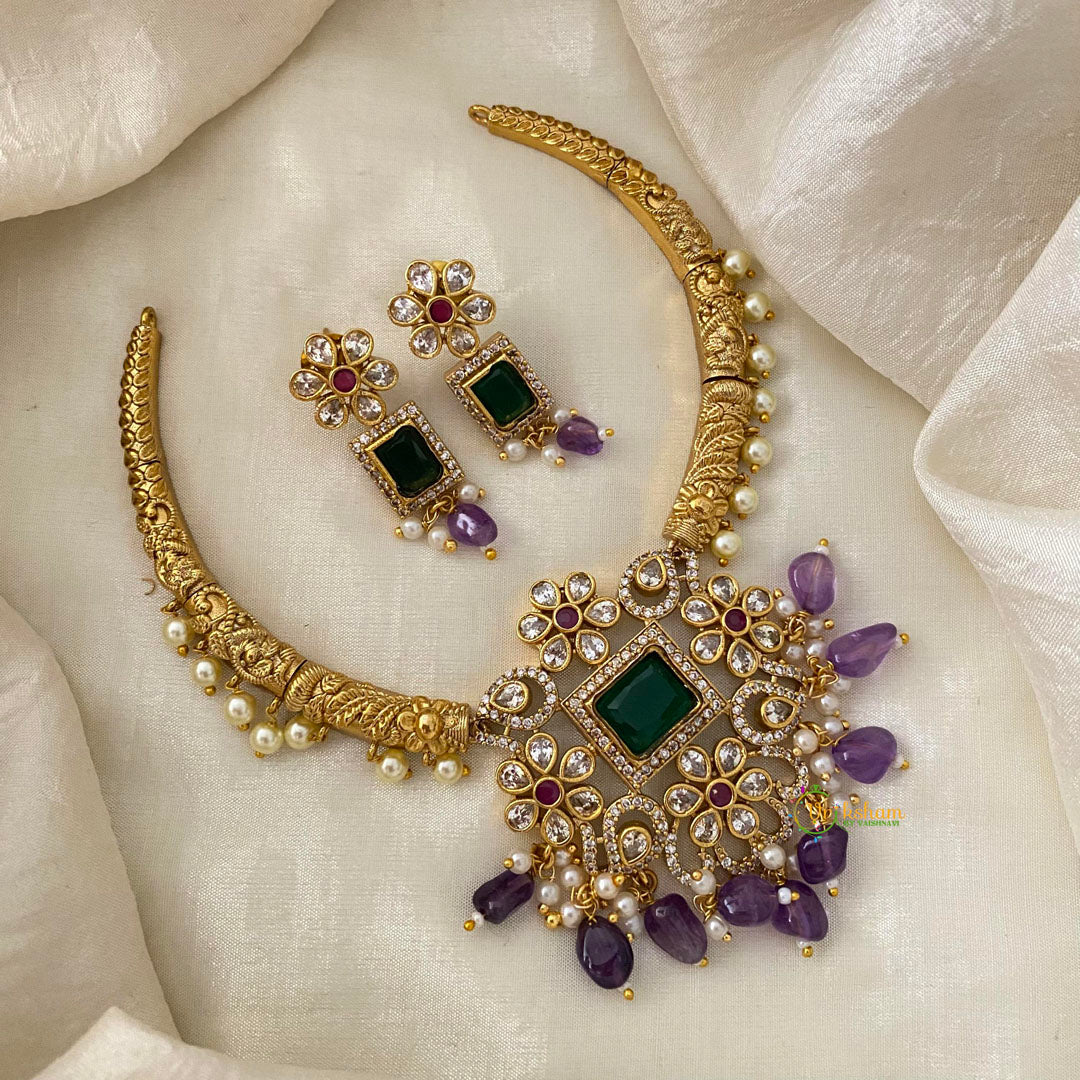 Premium AD Stone Hasli Choker-Purple Beads- Premium AD Stone Hasli Choker with the pattern of one big green square surrounded by white AD Stone flower with touch of red stone. For finishing purple beads and pearls are used to make it more attractive. Hasli short neckpiece, comes with matching earrings.