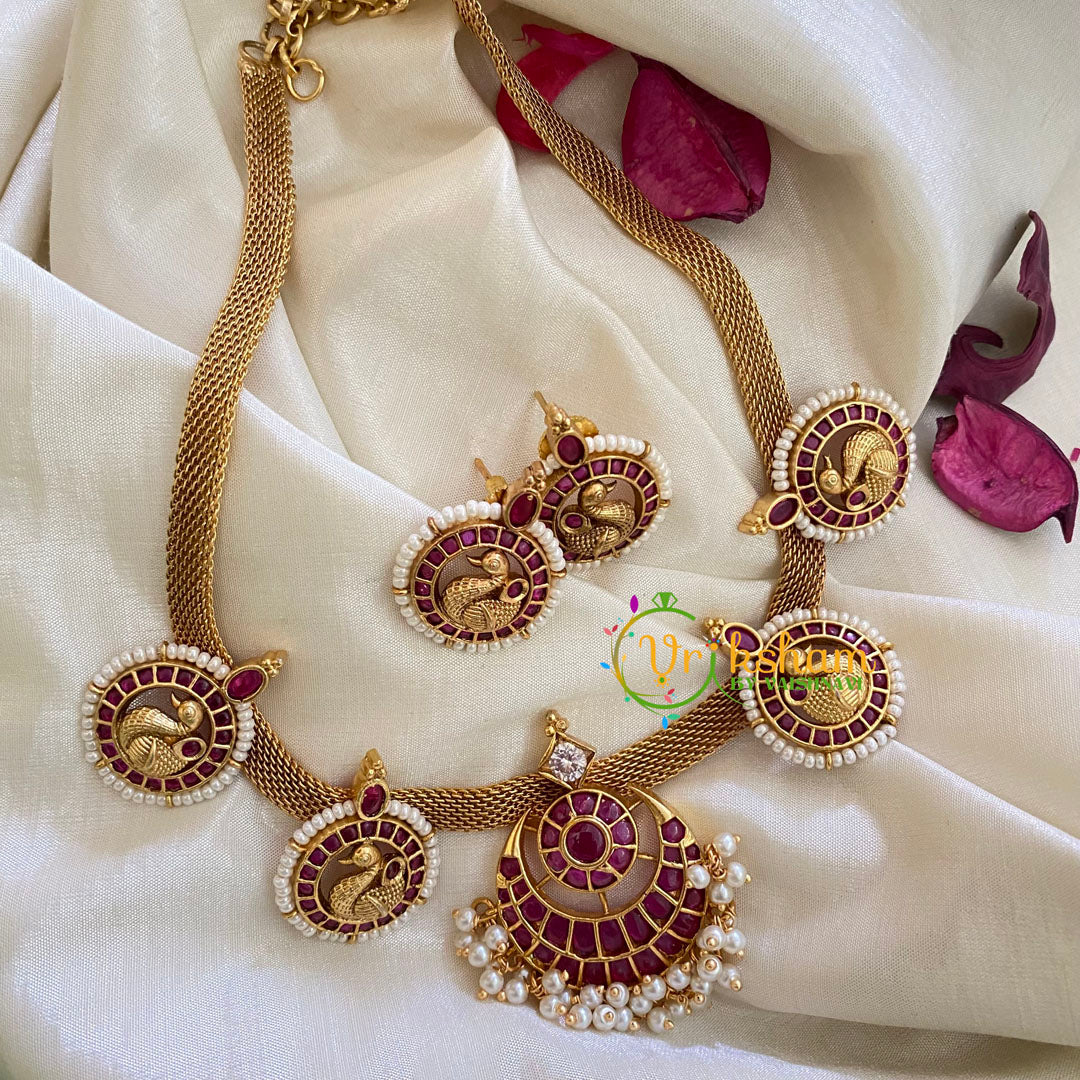 Premium AD Stone Hasli Choker-Red and centre WHITE stone Pearl finish - swan pendants short neckpiece, comes with matching earrings.