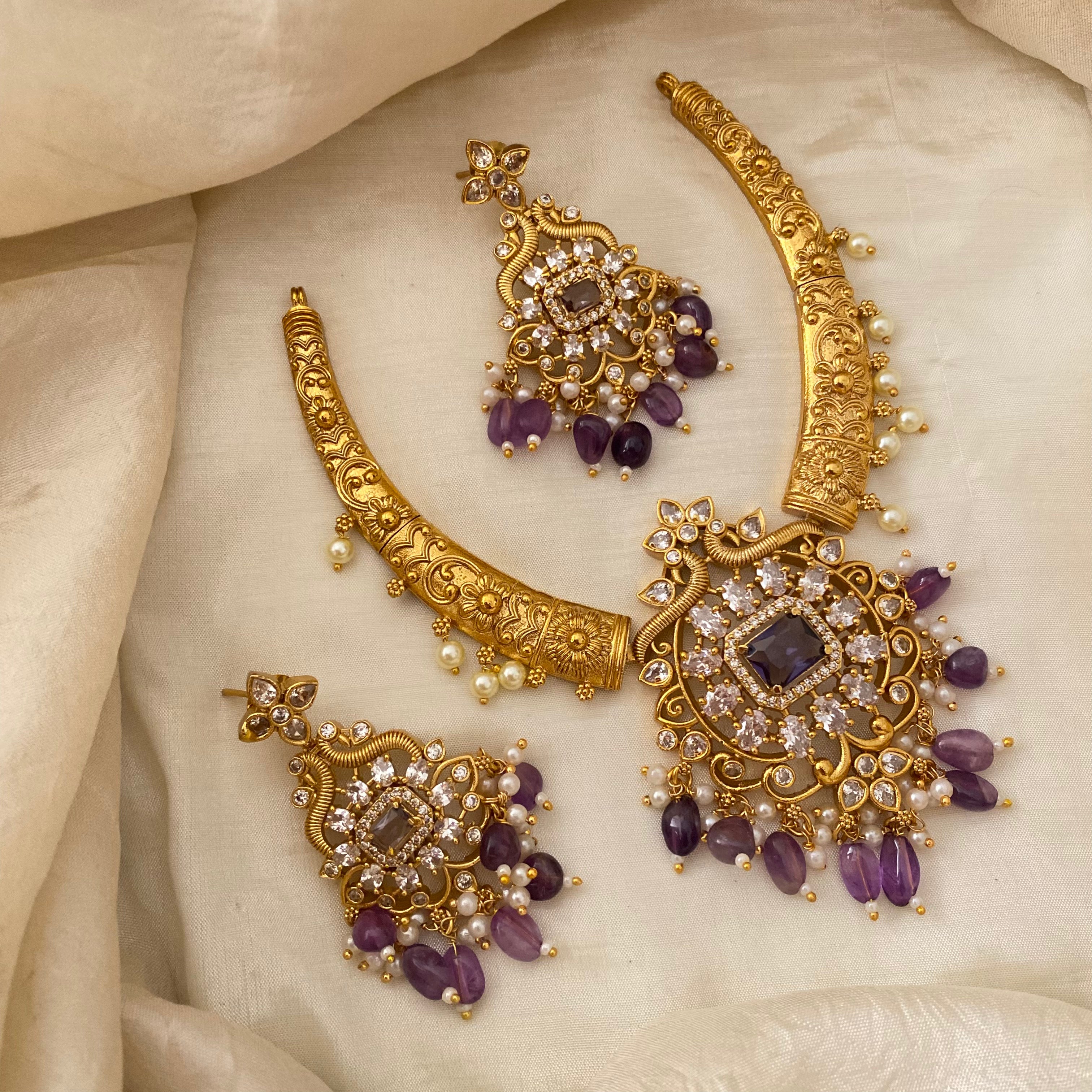 Premium AD Stone Choker Neckpiece-Purple- Premium gold look alike AD stone patterned hasli neckpiece with earrings.