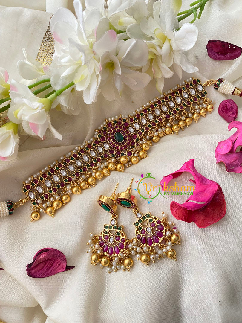 Premium AD stone High Neck Choker -Red and Green (centre) kemp and white AD stone studded premium quality high neck choker; Gold bead finish. Comes with matching ear hangings.