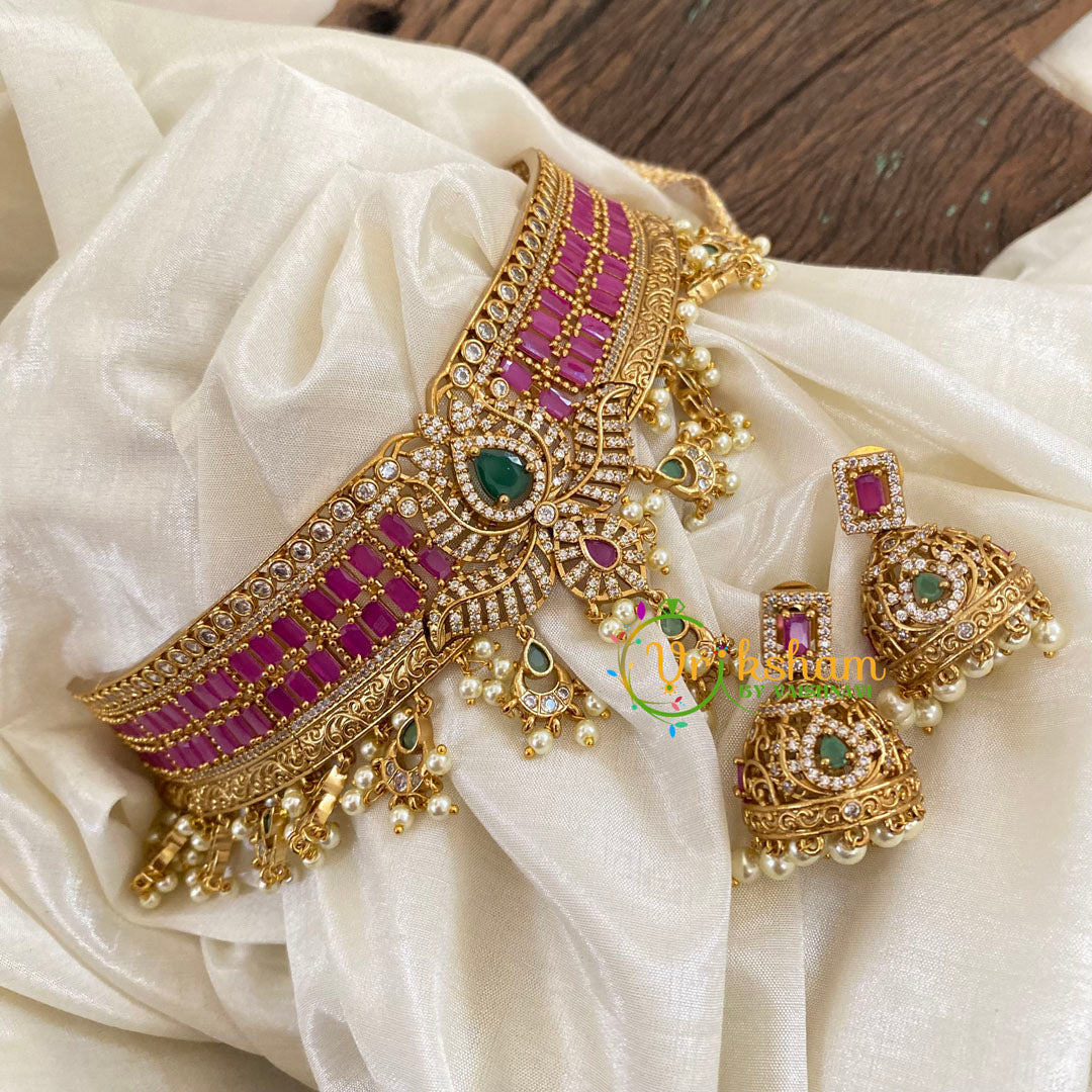 Premium AD Stone High Neck Choker -Gold Bead Pearl finish, red and green stone studded choker; comes with matching Earrings.