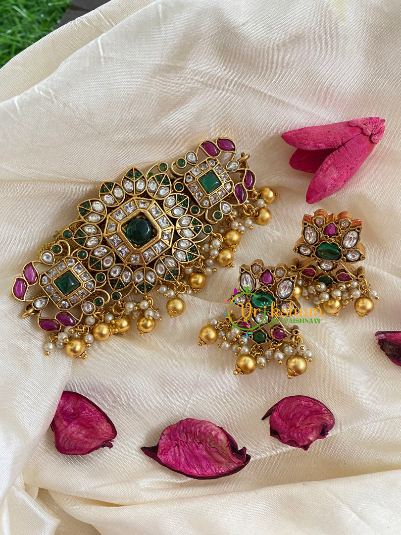 Premium AD Stone High neck Choker -White Green -Gold Bead finish-Centre Green stone and white, red– Gold look alike, floral pattern stone studded; Comes with a pair of earrings.