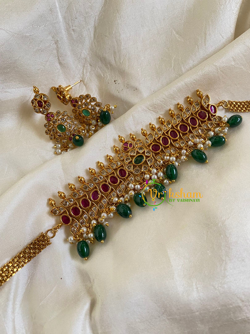 Premium AD Stone High Neck Choker –Green Bead -Gold look alike high neck choker with pendant comes with matching earring.