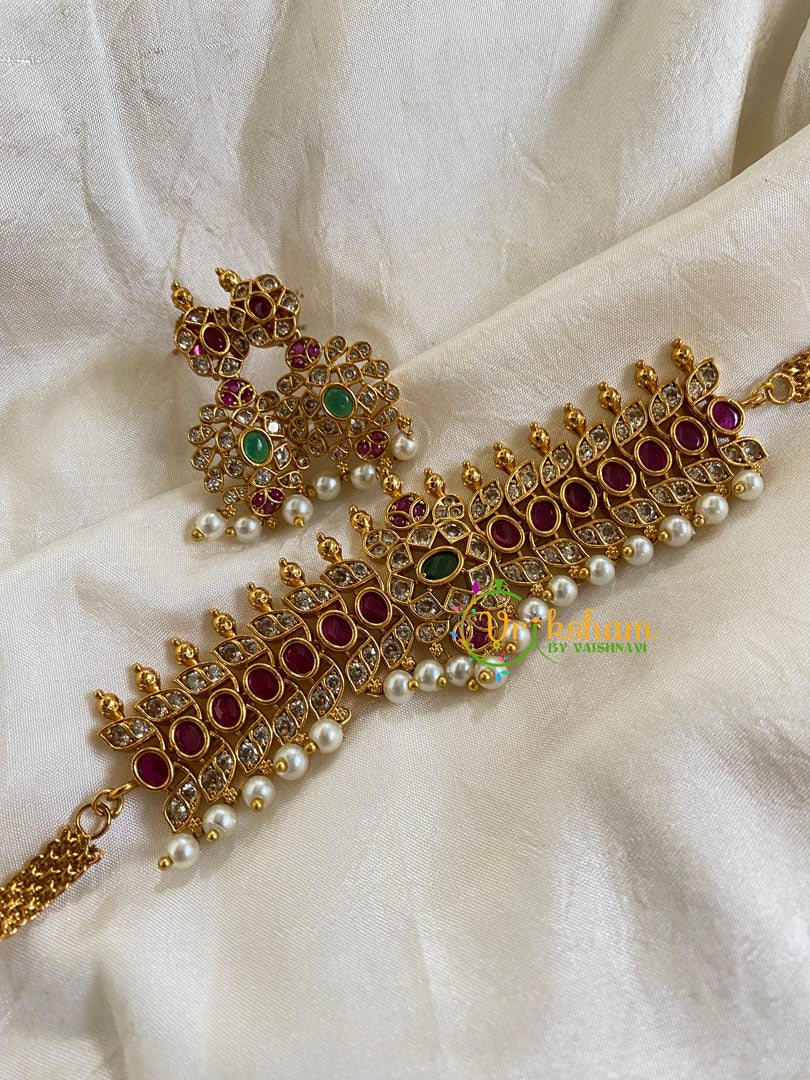 Premium AD Stone High Neck Choker –Pearl finish -Gold look alike high neck choker with pendant comes with matching earring.
