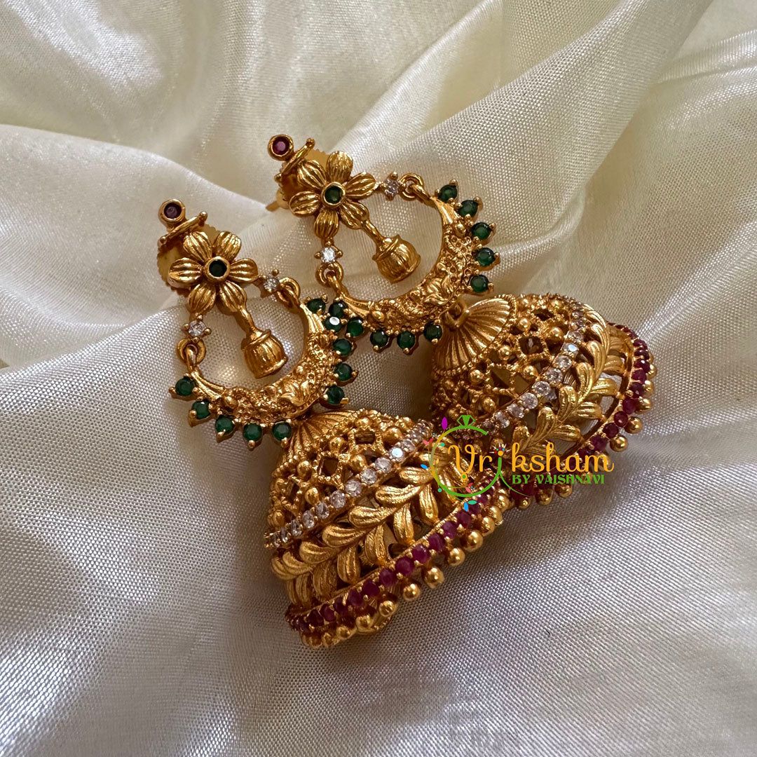 Premium AD Stone Jhumkas-Red Green regular stone studded stud base jhumkas ; premium matt finish earrings.
