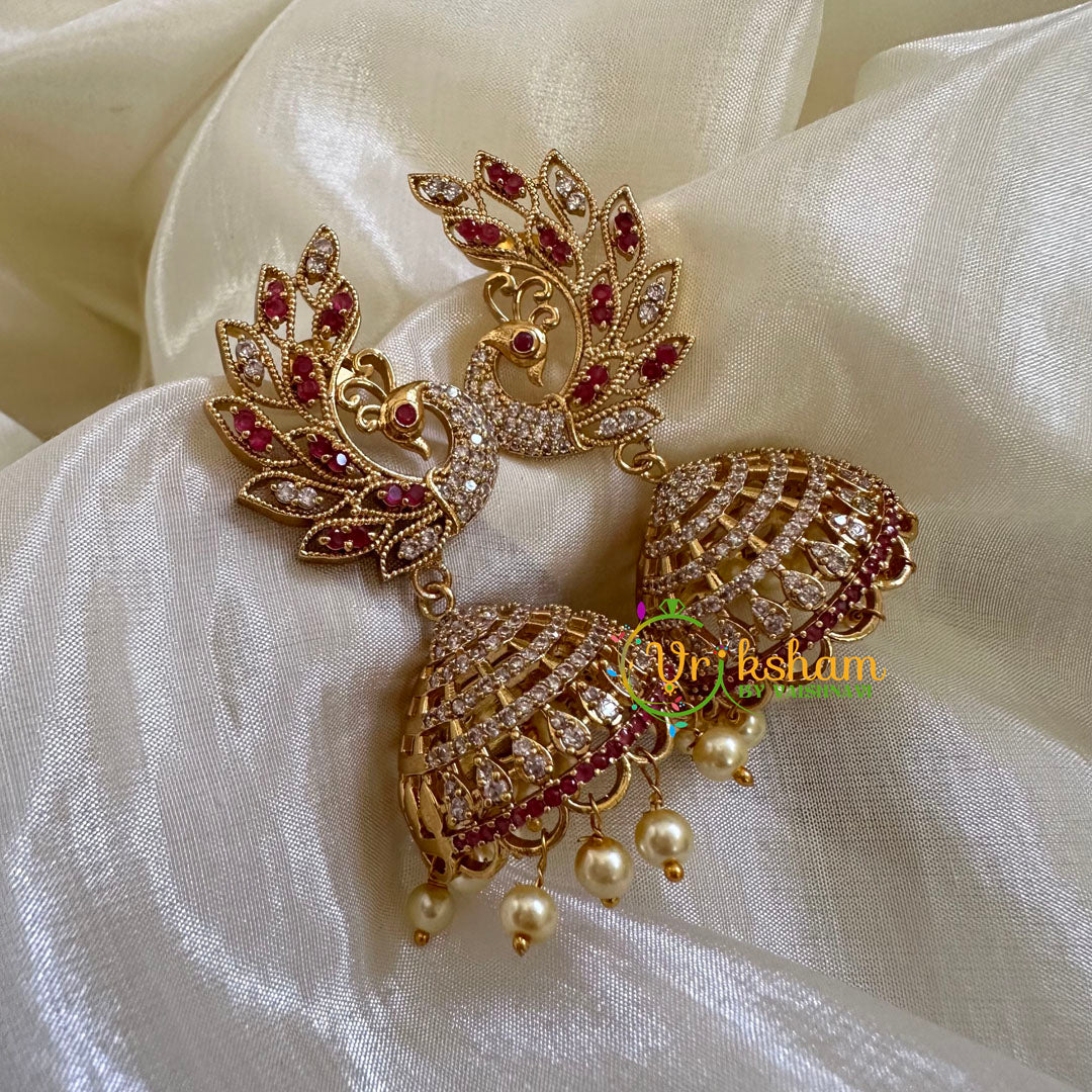 Premium Peaock AD Stone Jhumkas -Red White- G10433