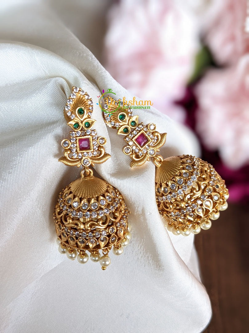 Premium AD Stone Jhumkas -Peacock feather Shape – Premium Quality is gold look alike earrings. This earrings is having a peacock feather style stud with a multi layer stone embedded jhumka which also has a pearl embalishments at the bottom.