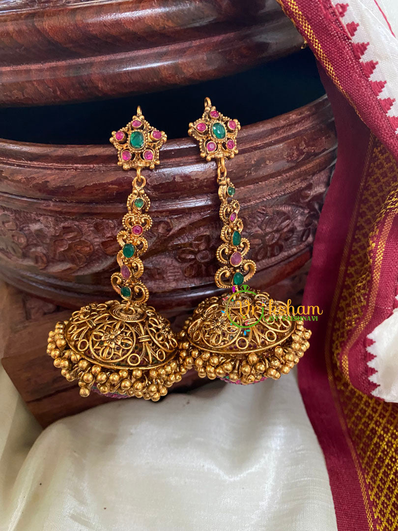 Premium AD Stone Long Jhumkas – Red and Green AD stone; Floral and Leaf Pattern ; ghungroo finish.