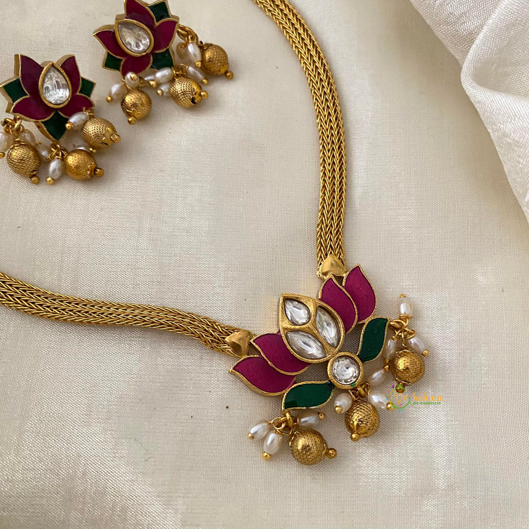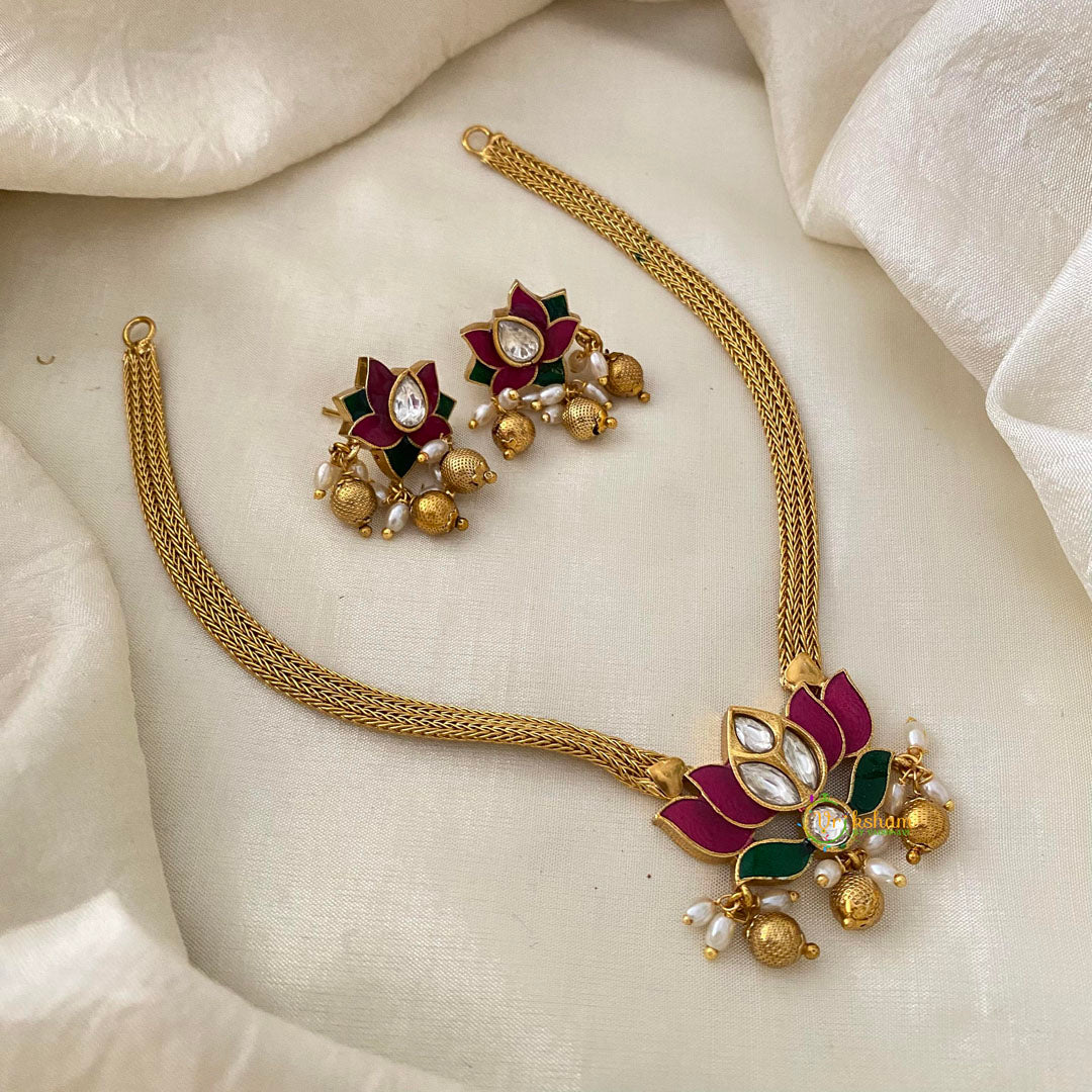 Premium AD Stone Lotus Addigai Choker-Rice Pearls - Premium quality red green, white AD Stone studded lotus addigai which follows the design of one lotus in center with three colour in center. Finishing is given with rice pearls and golden pearls to make more stunning for your special occasion. Addigai short neckpiece, comes with matching earrings.