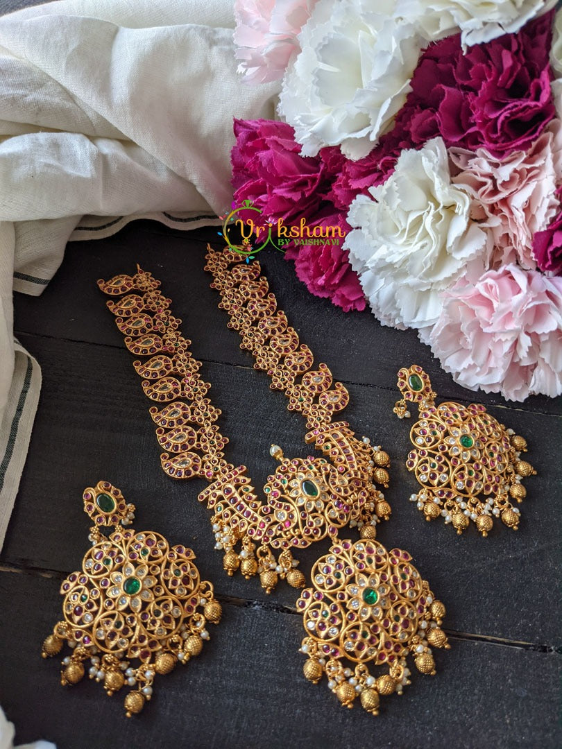 Premium AD Stone Maanga Choker Neckpiece -Red White Green ad stone imitation Maanga or paisley pattern with green centre stone; bead finish; comes with matching danglers.