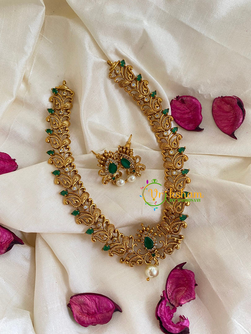 Premium AD Stone Neckpiece -Centre green stone,and white ad stone studded floral pattern with pearl finish. Comes with matching ear hangings.
