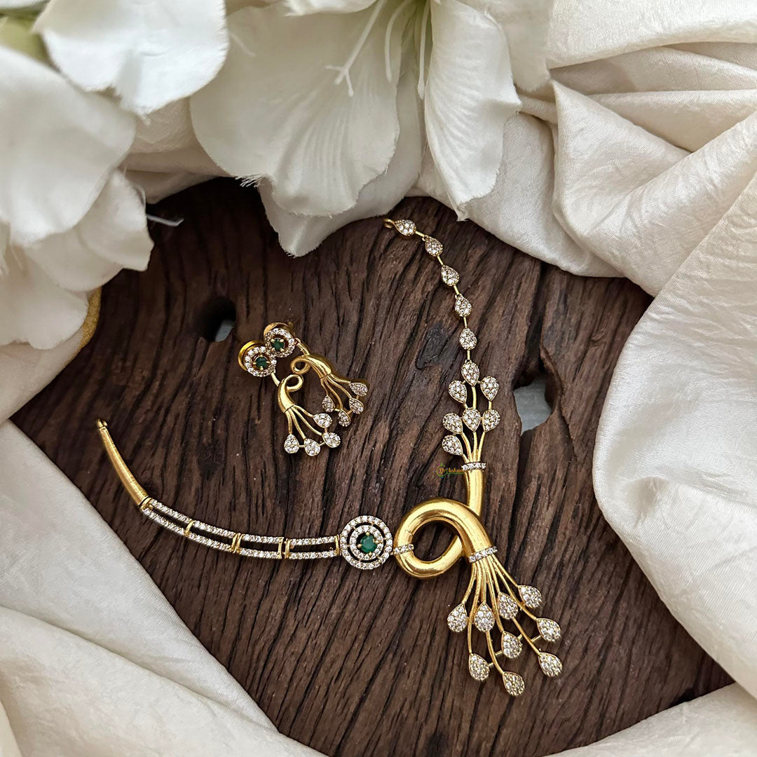 Elevate your style with our Premium AD Stone One Stan Peacock Hasli Choker! Each exquisite piece comes with matching earrings for a complete and stunning look. Experience the beauty and elegance of this choker, adorned with green and white stones and a majestic peacock design. Make a statement and turn heads wherever you go!