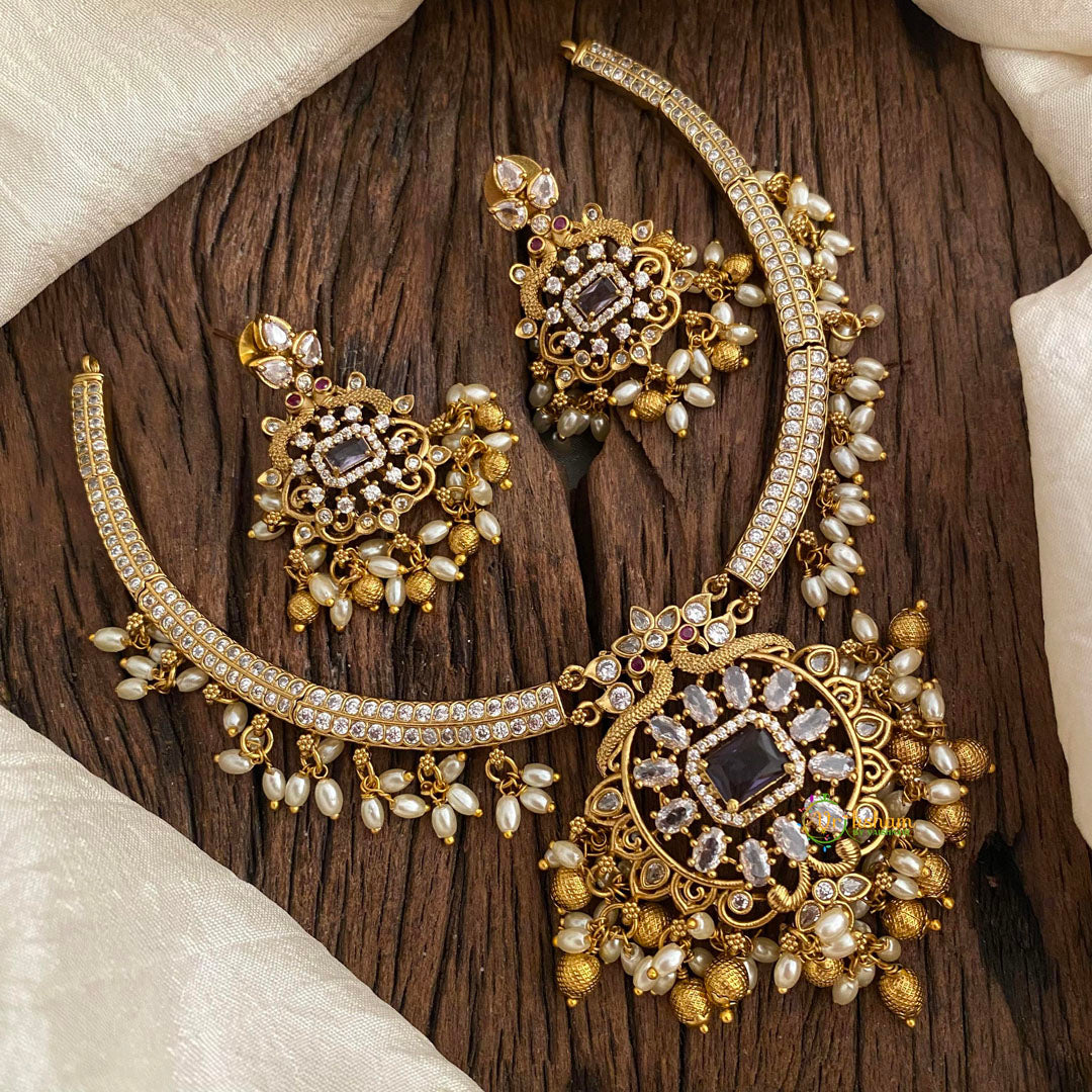 Premium AD Stone Pendant Hasli Choker-Rice Pearls- Premium gold look alike red, white AD Stone Pendant Hasli Choker with the pattern of one big purple square in center surrounded by white AD Stone as well as dual peacock on top with touch of red stone. For finishing rice and golden pearls are used to make it more stunning. Hasli short neckpiece, comes with matching earrings.