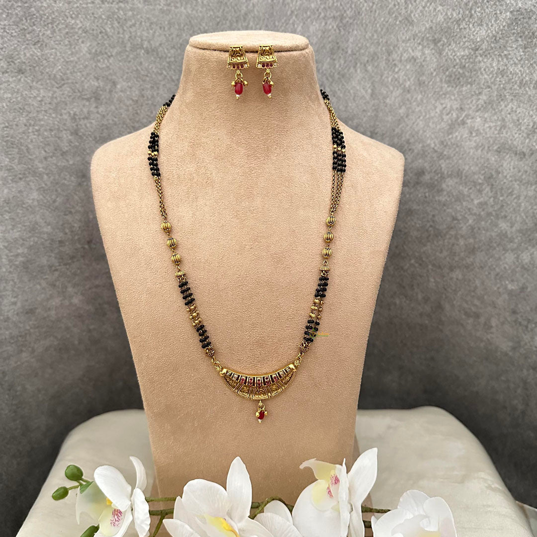 This exquisite mangalsutra chain is adorned with premium AD stones and a gorgeous red bead pendant, giving it a sophisticated and exclusive look. Perfect for any special occasion, this piece will add a touch of elegance to your ensemble. Complete your luxury jewelry collection with this stunning piece. Comes with matching earrings.