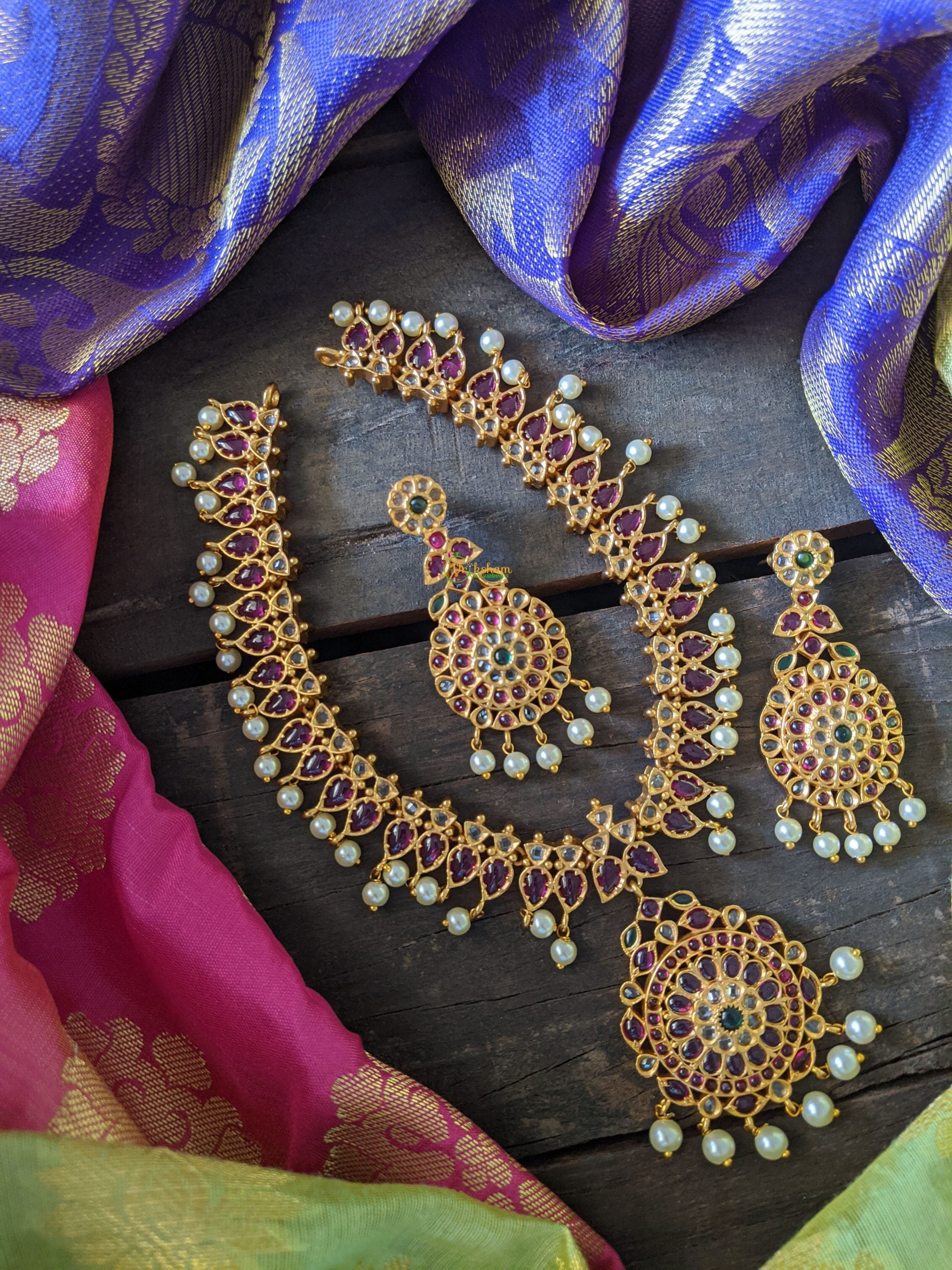 Premium AD stone Pendant Neckpiece -Premium quality AD stone set short neckpiece , predominantly red stone with pearl finish; other color stones set in them- green and white. Comes with pair of ear hangings.