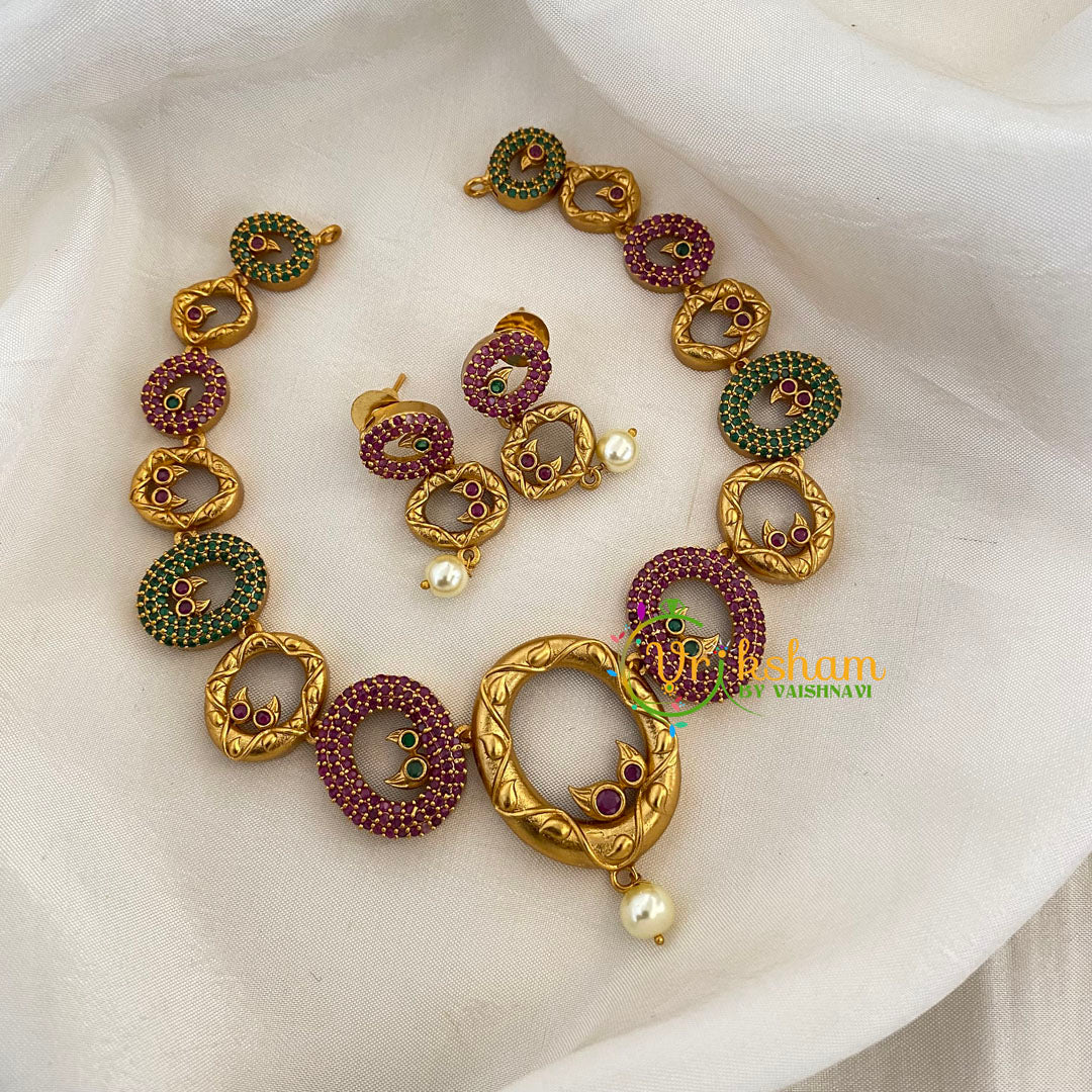 Premium AD Stone Short Neckpiece-Red Green - Loop shaped rings made together into a neckpiece. Pearl finish; comes with matching earrings.