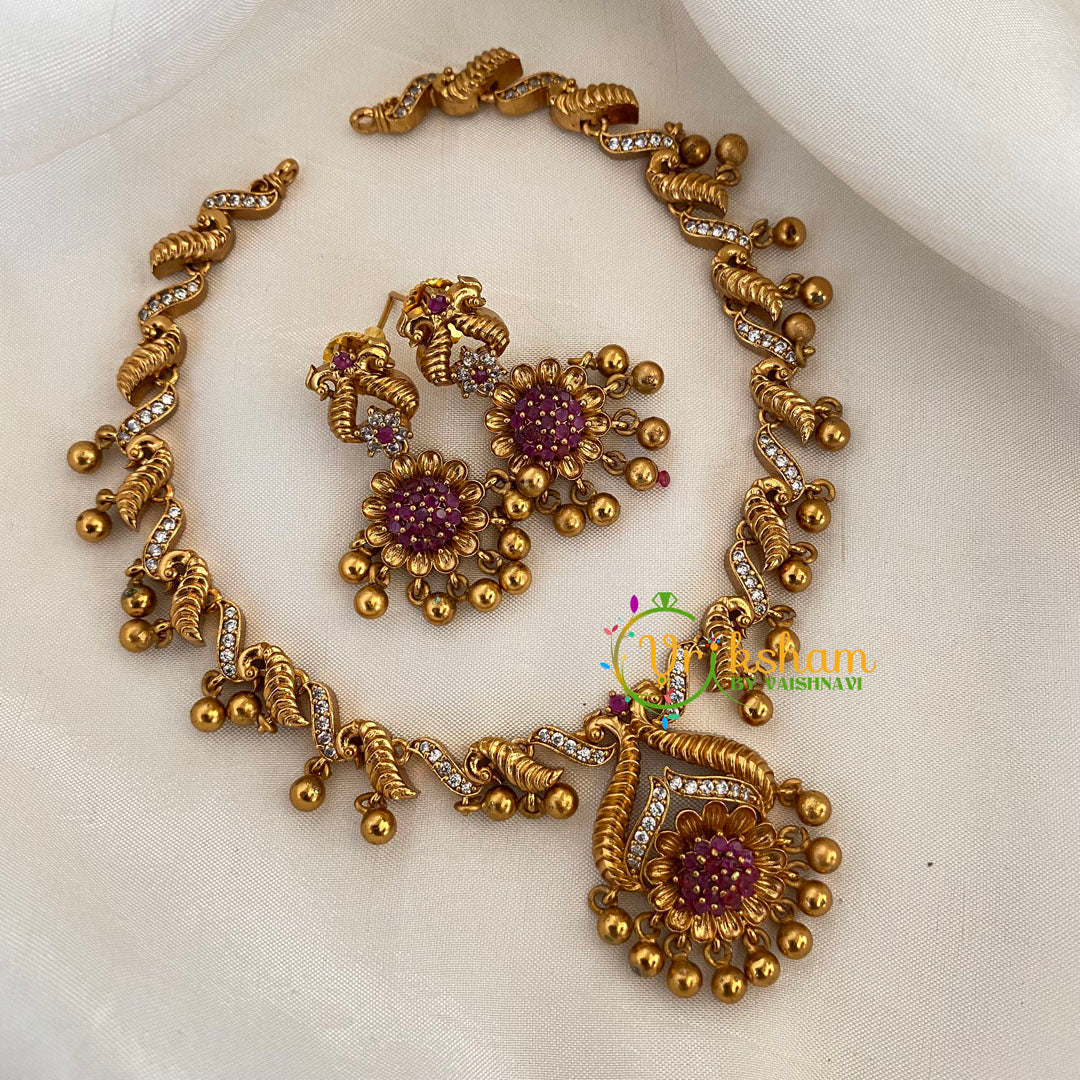 Premium AD Stone Short Neckpiece-Red - Uniquely designed short pendant neckpiece. Gold bead finish; comes with matching earrings.