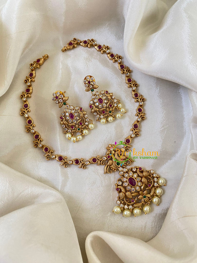 Premium AD Stone Short Neckpiece-Red Green - Uniquely designed short pendant neckpiece. Pearl finish; comes with matching earrings.