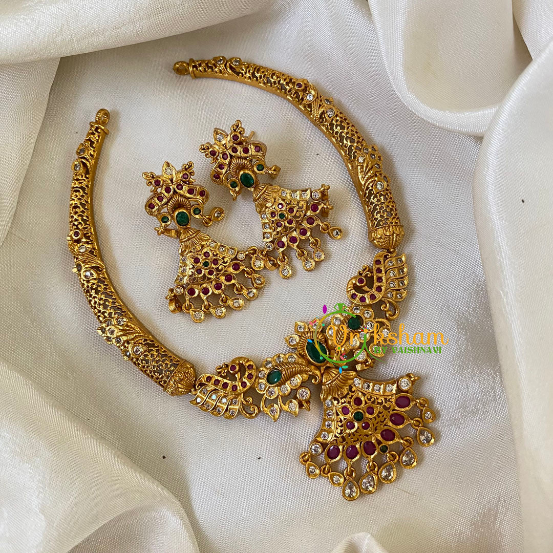 Premium AD Stone Short Neckpiece with pendant - Premium quality short neckpiece - Red White and Green stones, comes with similar matching ear hangings.