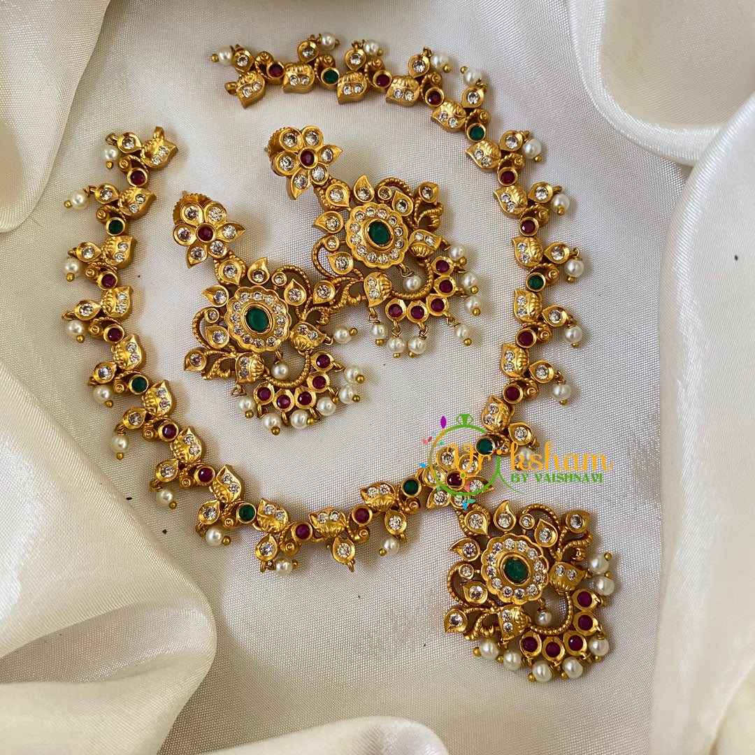 Premium AD Stone Short Neckpiece with Pendant - Premium quality short neckpiece - Red White and Green stones, comes with similar matching ear hangings.