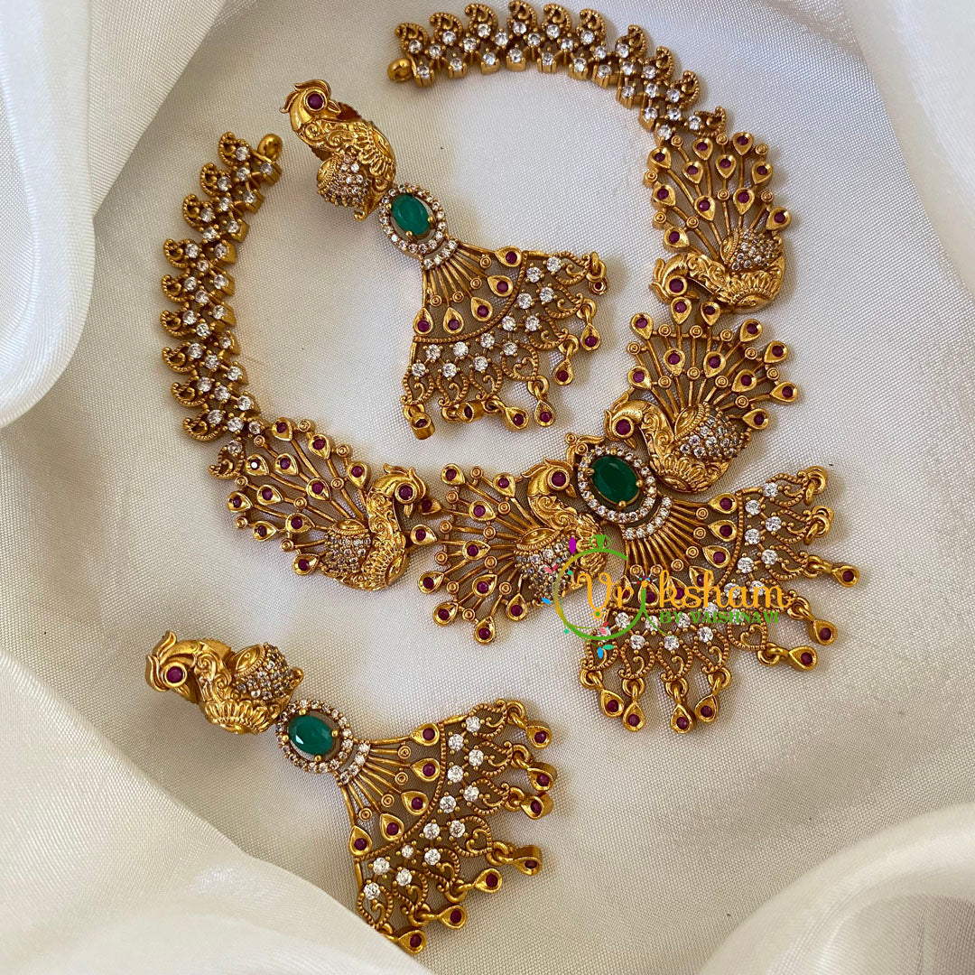 Premium AD Stone Short Neckpiece with Pendant - Premium quality short neckpiece - Red White and Green stones, comes with similar matching ear hangings.