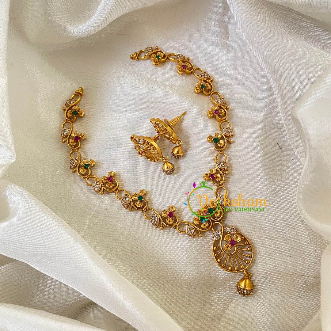 Premium AD Stone Short Neckpiece - White and green stones studded short neckpiece with Beads pendant; comes with matching earrings.