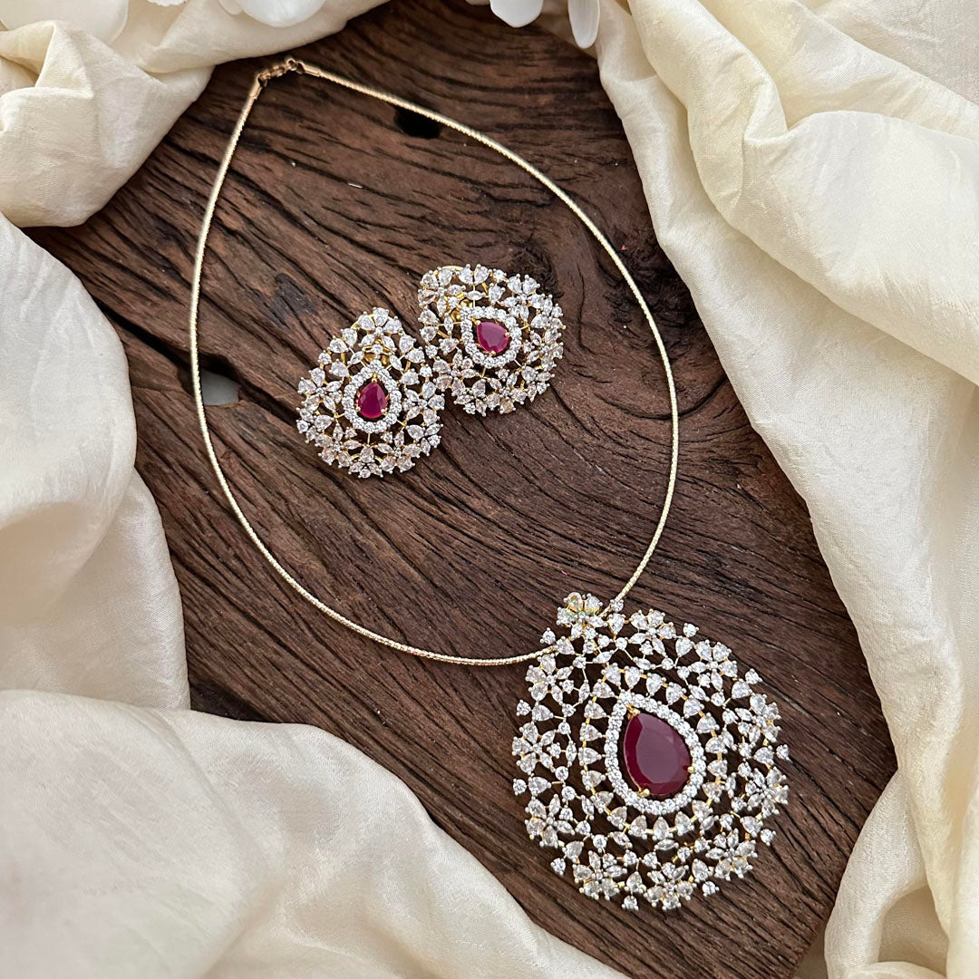 Indulge in luxury with our Premium American Diamond Hasli in red tilak shape. Adorned with a stunning red center stone and surrounded by glistening white gems in a ganga-jamuna style, this elegant piece will add a touch of sophistication to any outfit. Complete the look with the matching studs for a truly exclusive experience.