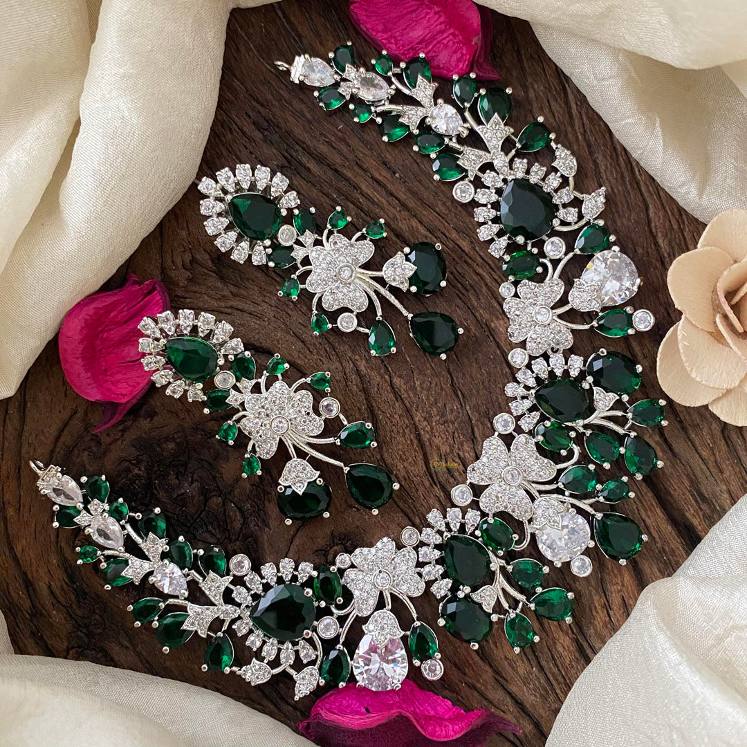 Introducing our exquisite Premium American Diamond Short Neckpiece in the delicate hue of Green - a true gemstone of sophistication and elegance. Elevate your style with this luxurious and exclusive piece, crafted with the finest materials and intricate details reminiscent of the world of art, literature, and fashion. Perfectly complement any ensemble, creating a refined and tasteful look. Comes with matching stone ear hangings.