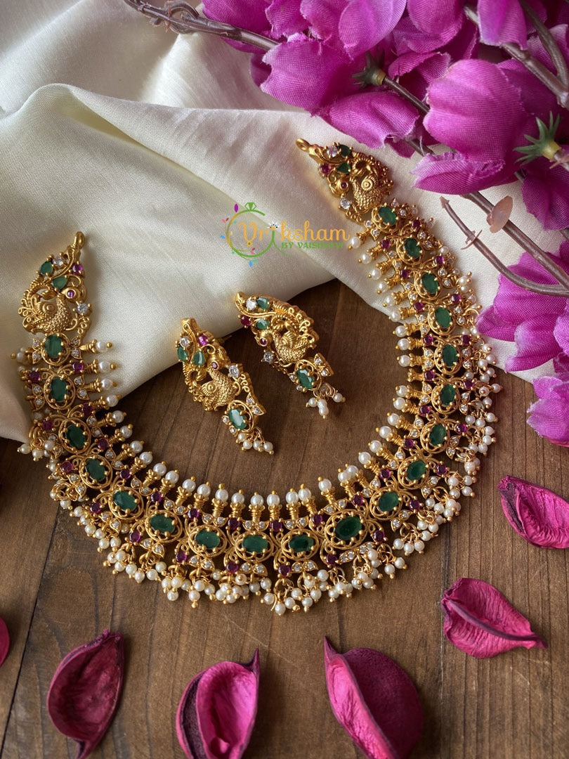 Premium Antique AD Stone Choker -Green White-Peacock Short neckpiece , with stone and pearls , comes with matching ear hangings.