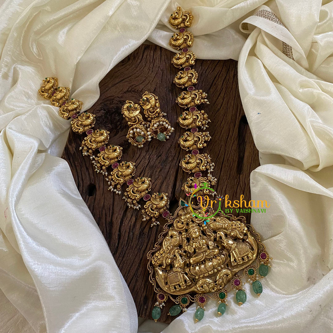Premium Antique Temple Haram - Lakshmi haram-Intricately Designed Temple Neckpiece ad stone ; lakshmi pendant; comes with matching ear earrings. Premium polish and green bead finish.