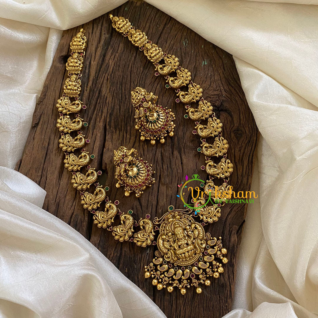 Premium Antique Temple Haram - Lakshmi haram-Intricately Designed Temple Neckpiece  ad stone ; lakshmi pendant;  comes with matching ear earrings.