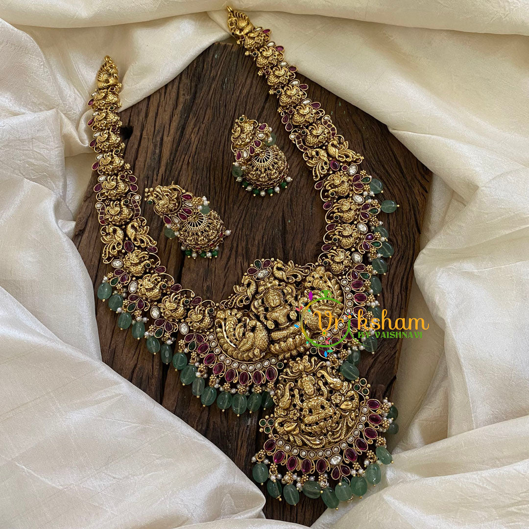 Premium Antique Temple Haram - Lakshmi haram-Intricately Designed Temple Neckpiece ad stone ; lakshmi pendant; comes with matching ear earrings.