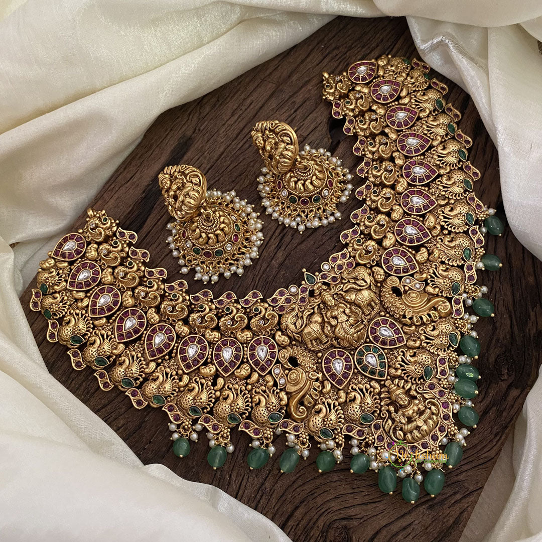 Unleash your passion for elegant jewelry with ourLight Green Bead Premium Antique Temple Lakshmi Choker Short Neckpiece. This stunning piece features a beautiful combination of peacock and red green paisley patterns in gold, intricately designed with a center Lakshmi idol. Complete the look with the included matching earrings